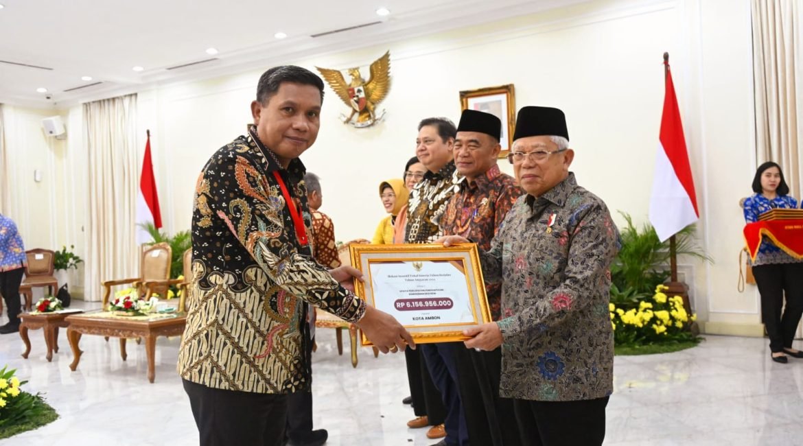 PMN.COM (Jakarta) - Pemerintah Kota (Pemkot) Ambon menerima penghargaan berupa Alokasi Insentif Fiskal Tahun Berjalan 2023 dari Pemerintah Pusat (Pempus) atas ke Piagam penghargaan Alokasi Insentif Fiskal dengan nilai Rp 6.156.956.000 tersebut diserahkan langsung oleh Wakil Presiden (Wapres ) RI, K.H Ma'ruf Amin, dan diterima Pj. Wali Kota Ambon, Bodewin...