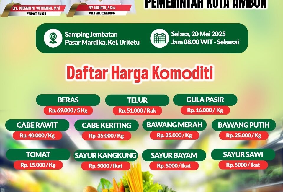 Ambon,PPID - Dalam rangka menjaga substansi pasokan dan harga pangan, Pemerintah Kota (Pemkot) Ambon melalui Dinas Pertanian dan Ketahanan Pangan kembali menggelar Gerakan Pangan Murah (GPM). Kegiatan tersebut, menurut Plt. Kepala Dinas Komunikasi Informatika dan Persandian Kota Ambon, selaku Juru Bicara (Jubir) Kota Ambon, Ronald Lekransy, dijadwalkan akan berlangsung selama...