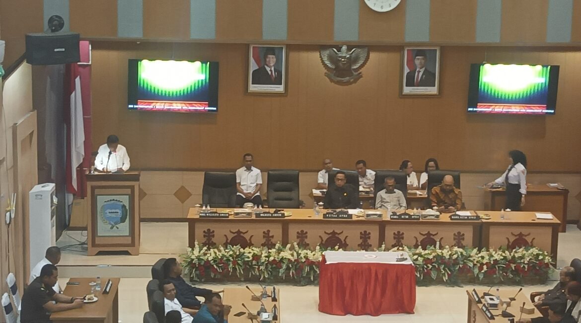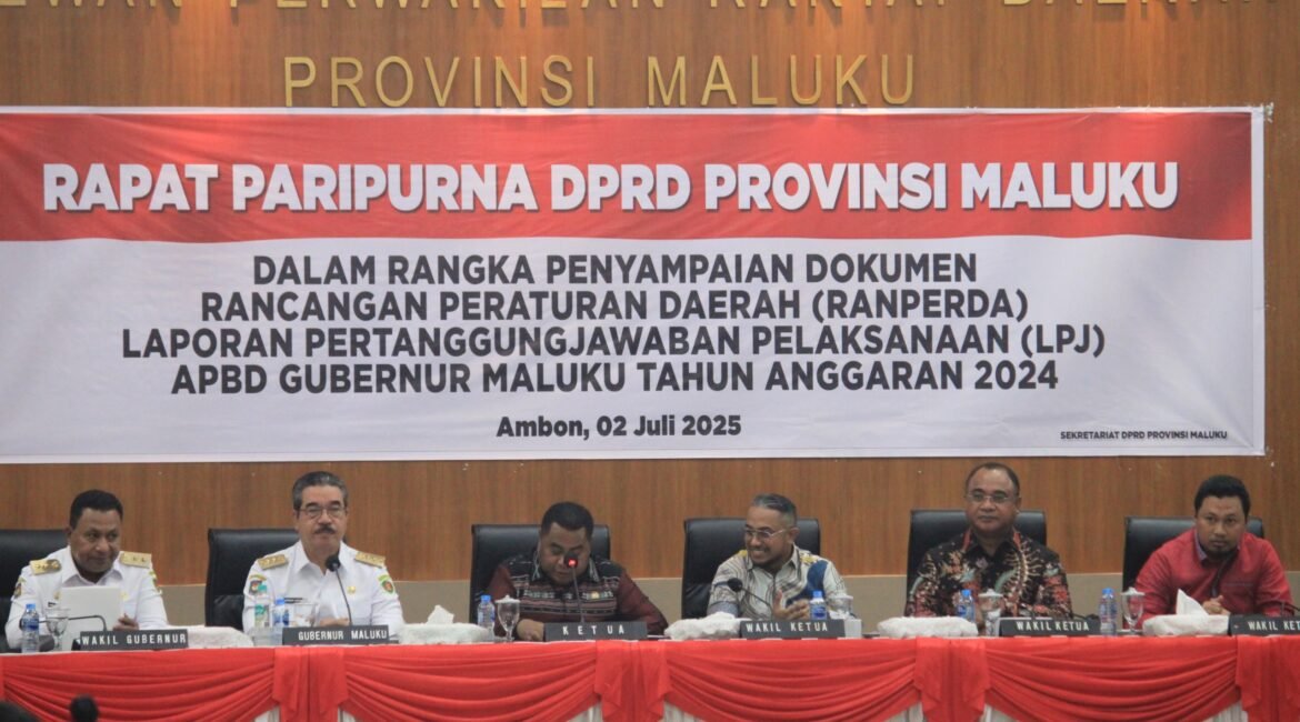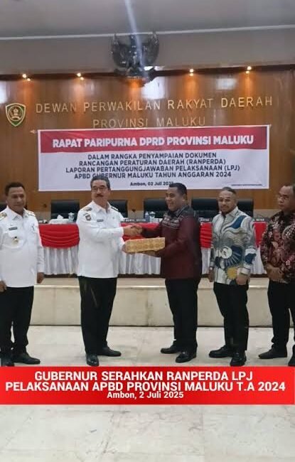 PMN.com Ambon – Gubernur Maluku Hendrik Lewerissa menyampaikan Dokumen Rancangan Peraturan Daerah (RANPERDA) Laporan Pertanggungjawaban (LPJ) Pelaksanaan APBD Gubernur Maluku Tahun Anggaran 2024, kepada Ketua Dewan Perwakilan Rakyat Daerah Provinsi Maluku Benhur G. Watubun, dalam Rapat Paripurna di Kantor DPRD Provinsi Maluku, Rabu (2/7/2025). Hadir juga pada kesempatan itu Wakil...