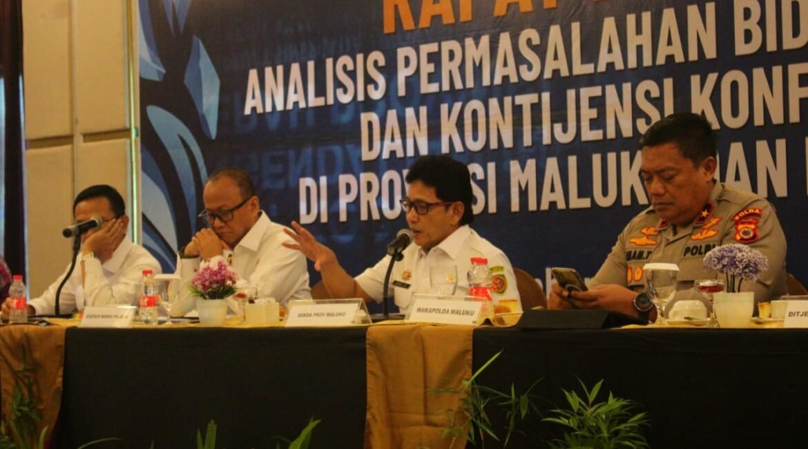 PMN com Ambon,- Sekretaris Daerah Maluku, Ir. Sadali IE, M.Si mewakili Gubernur Maluku Hendrik Lewerissa memberikan materi Strategi Penanganan Konflik Sosial dan Potensi Konflik Sosial di Provinsi Maluku pada Rapat Koordinasi Analisis Permasalahan Bidang Penanganan dan Kontijensi Konflik Sosial di Provinsi Maluku dan Maluku Utara bertempat di Swisbell Hotel, Rabu...