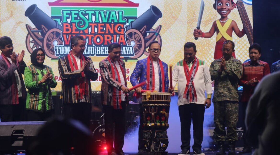 PMN COM-AMBON - Gubernur Maluku, Hendrik Lewerissa, menyaksikan pembukaan Festival Banteng Victoria yang ditandai pemukulan tifa oleh Wakil Menteri Dalam Negeri, Bima Arya, Wakil Gubernur Abdullah Vanath dan Wali Kota Ambon, Bodewin Wattimena di Lapangan Merdeka, Jum'at, 17 Oktober 2025. Pangdam XV Pattimura, Sekda Maluku dan Wakil Wali Kota Ambon...
