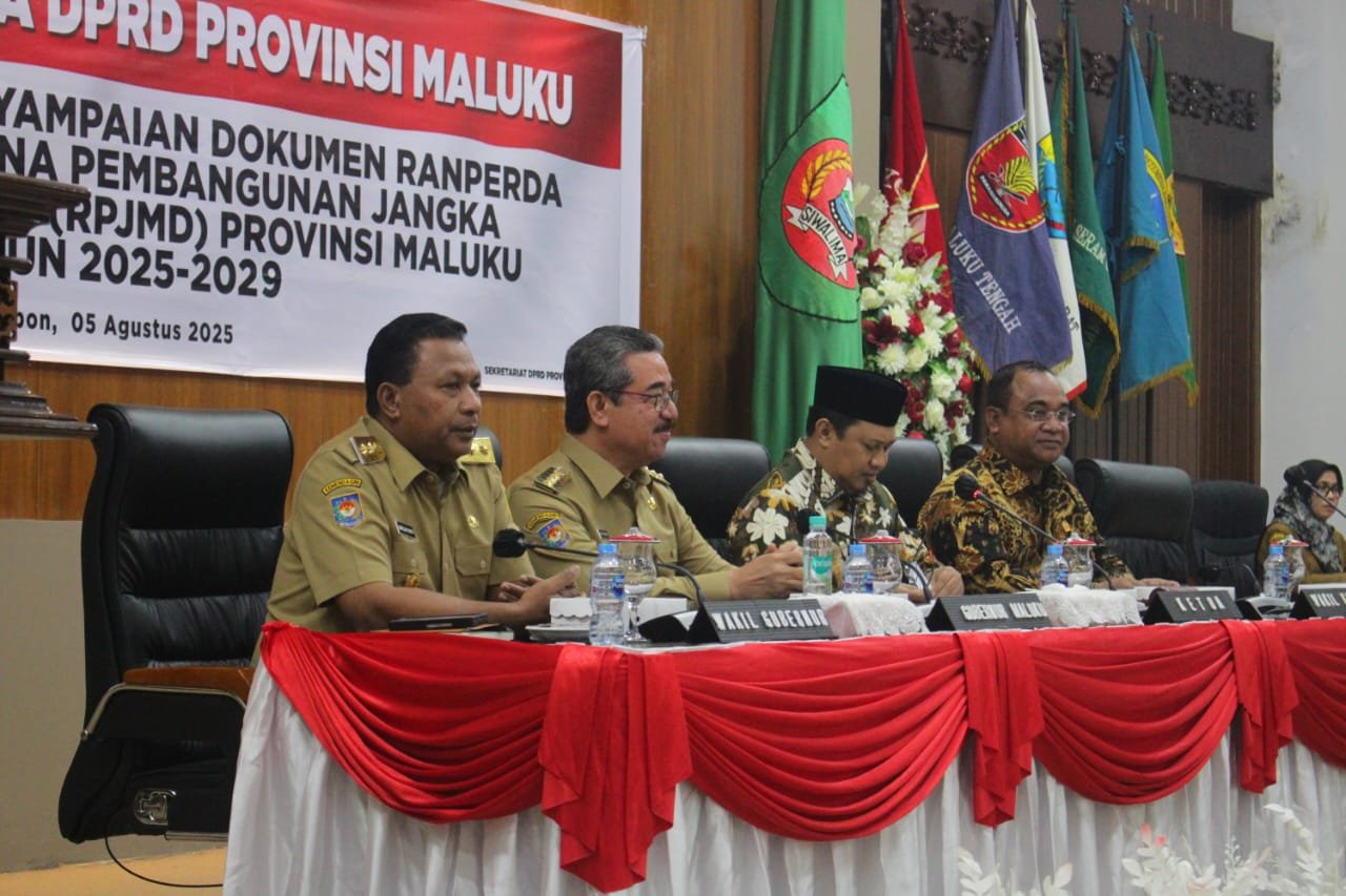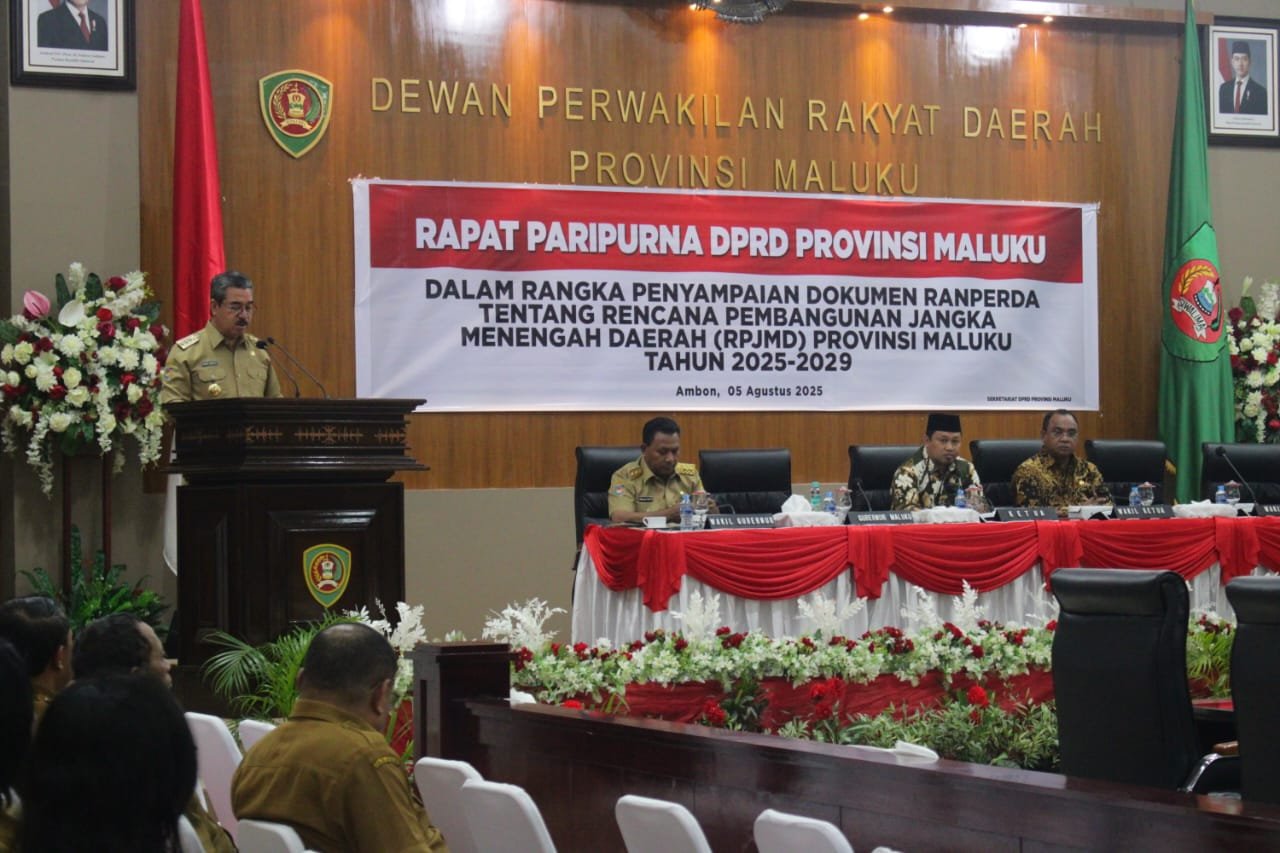 PMN com Ambon,- Gubernur Maluku Hendrik Lewerissa berkesempatan menghadiri secara langsung Rapat Paripurna DPRD Provinsi Maluku dalam rangka penyampaian Dokumen Rancangan Peraturan Daerah (Ranperda) tentang Rencana Pembangunan Jangka Menengah Daerah (RPJMD) Provinsi Maluku tahun 2025-2029, bertempat di ruang rapat DPRD Provinsi Maluku, Selasa (5/8/2025).