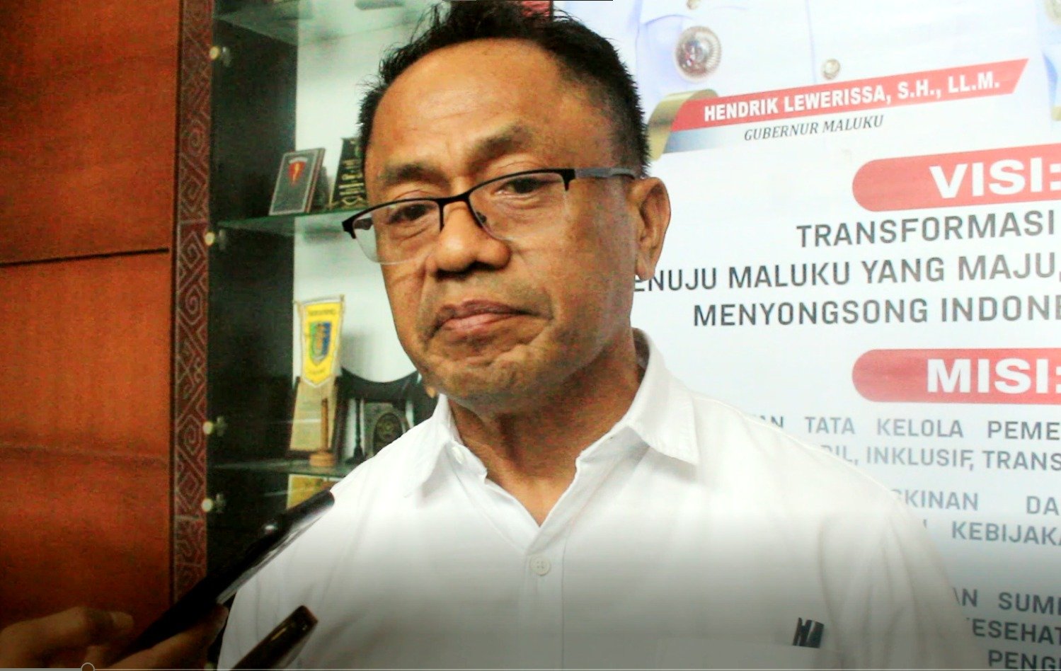 ‘PMN Ambon – Juru Bicara Gubernur Maluku, Kasrul Selang usai melakukan rapat terbatas antara Pemerintah Provinsi Maluku Bersama Forum Komunikasi Pimpinan Daerah Provinsi Maluku memberikan keterangan terkait pertemuan dimaksud yang bertempat di Lobby lantai 2 Kantor Gubernur Maluku, Rabu (9/7/2025).
