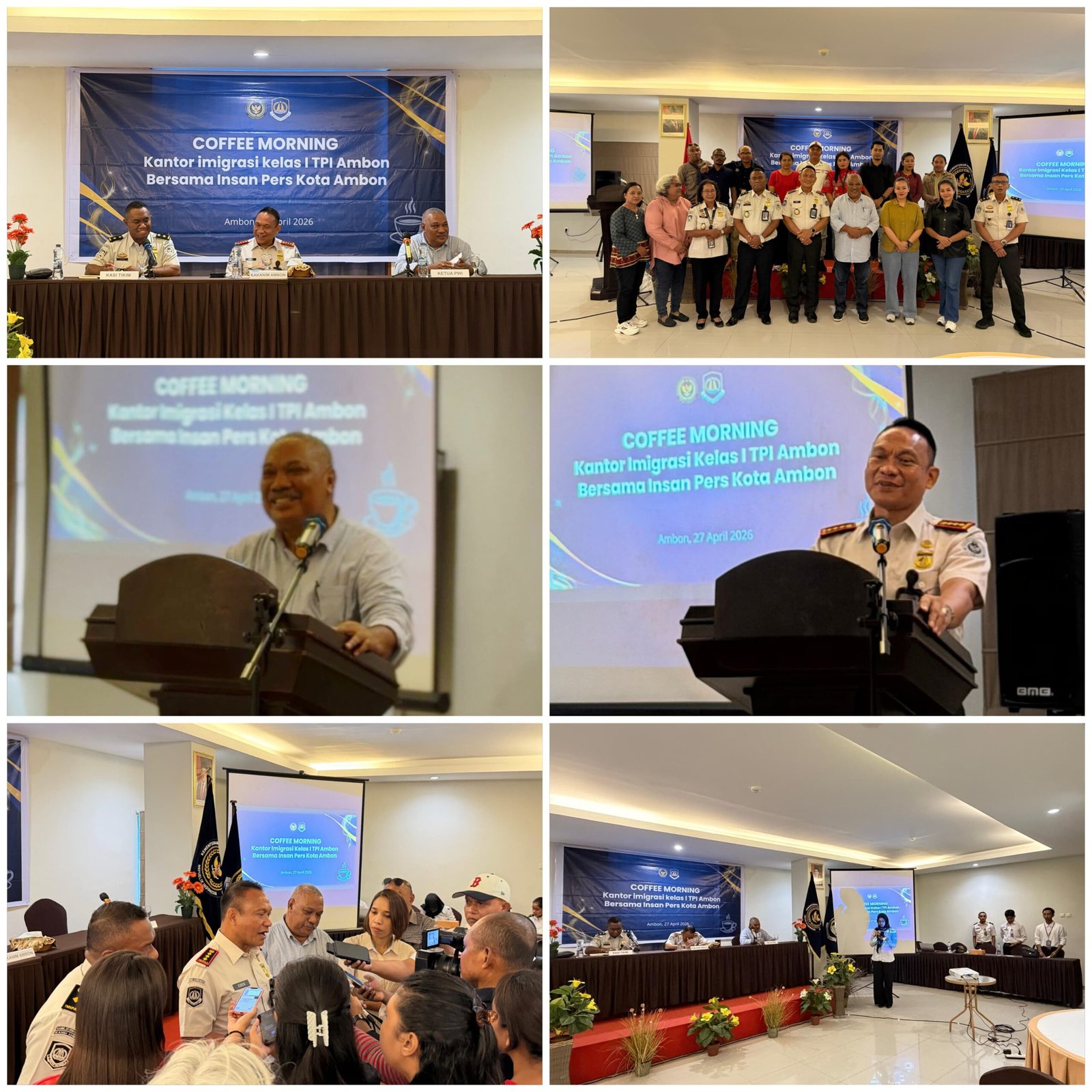 PMN COM Kantor Wilayah Direktorat Jenderal Imigrasi Maluku Melalui Kantor Imigrasi Kelas I TPI Ambon Bersama Insan Pers Kota Ambon Melksanakan coffe Morning dengan lokasi Aula Biz Hotel yang berlansung pada : Senin, 27 April 2026 Pukul : 09.00 WIT s.d. Selesai dengan melibatakan insan pers Bersama Kepala Kantor, Pejabat Struktural dan Pegawai.dilingkungan Direktorat jenderal IMIGRASI Maluku