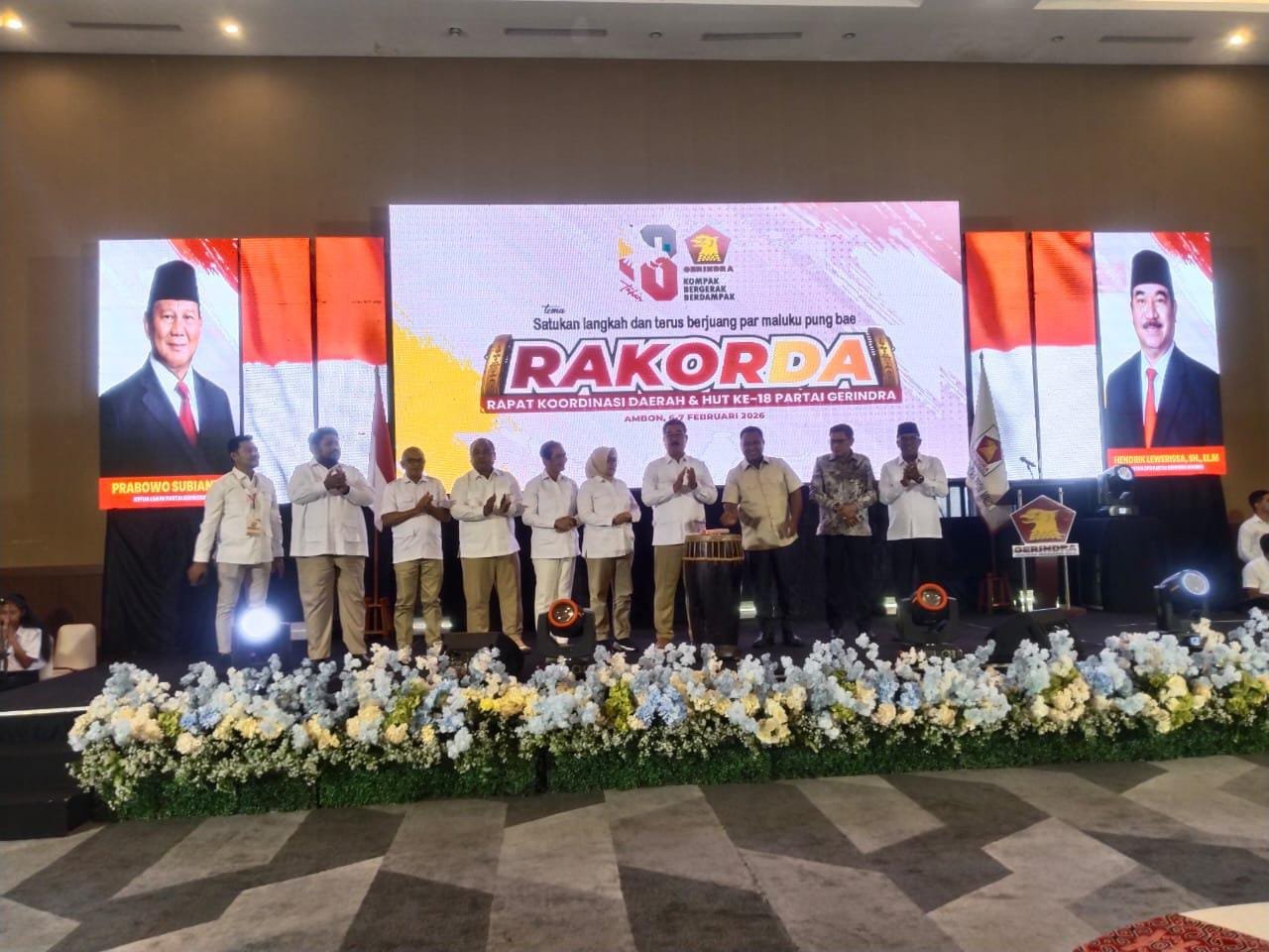 adapun Tema yang diangkat Pada HUT partai Gerindra ke 18 adalah Satukan Langkah dan Terus Berjuang Par Maluku Pung Bae.”